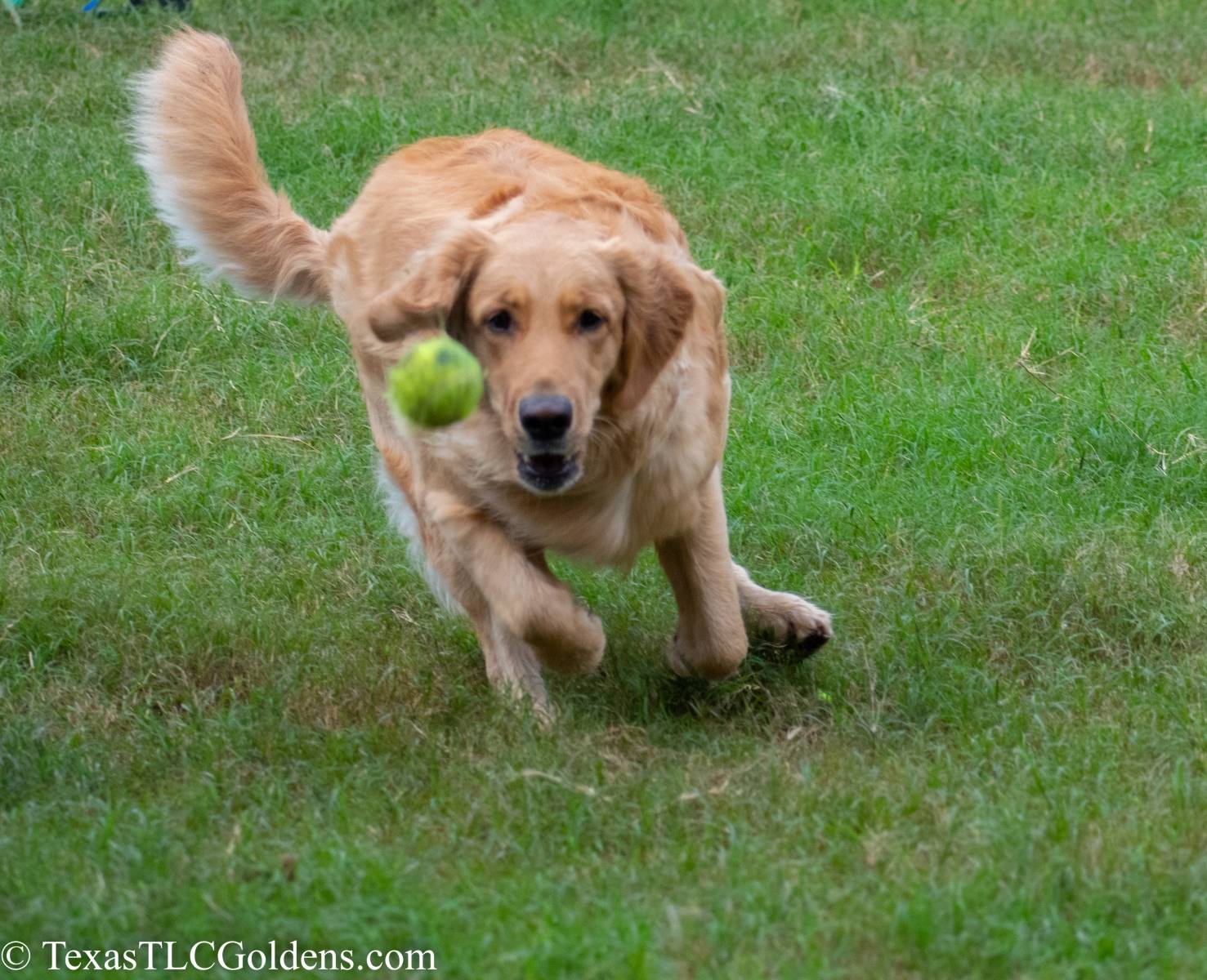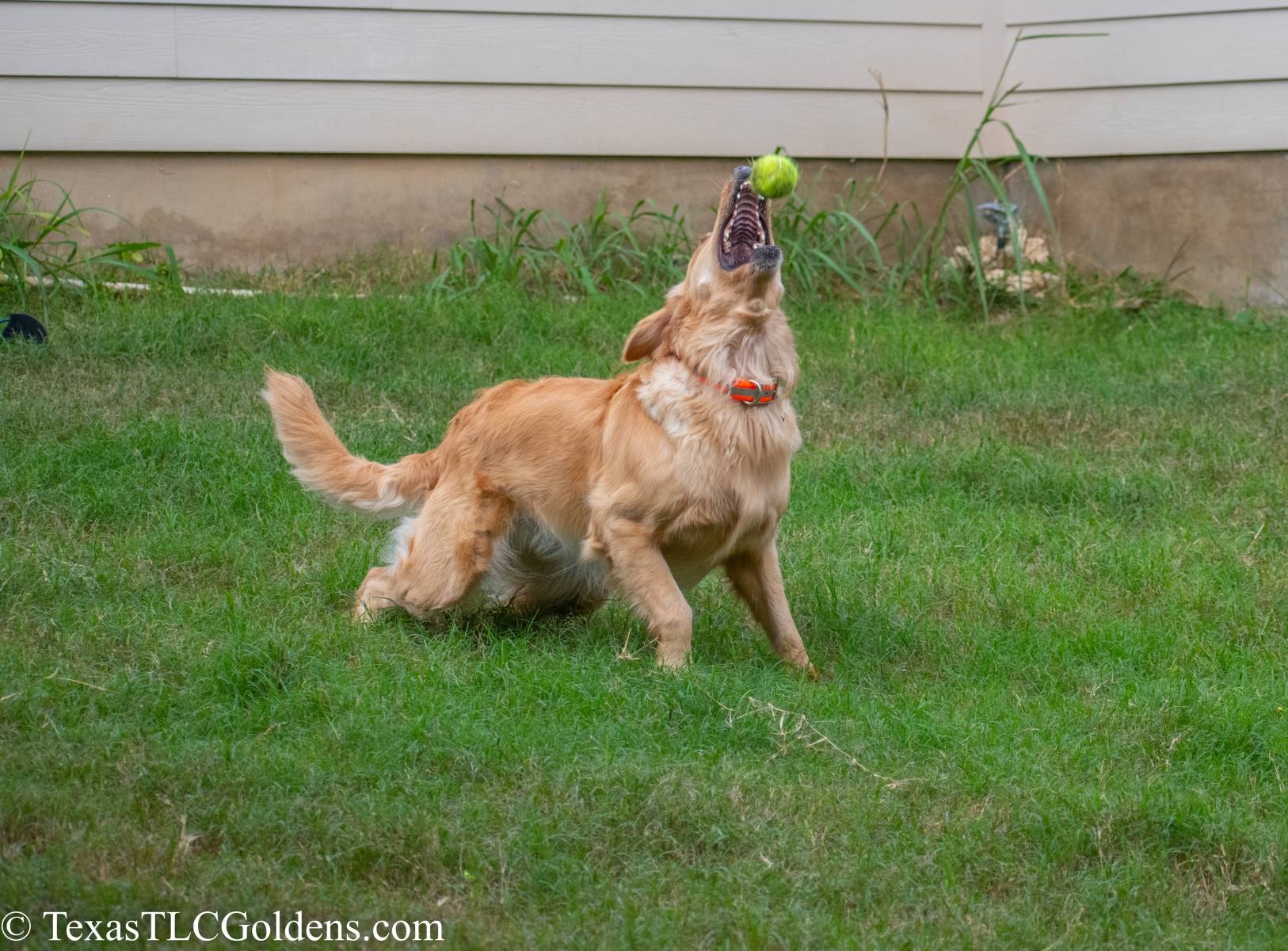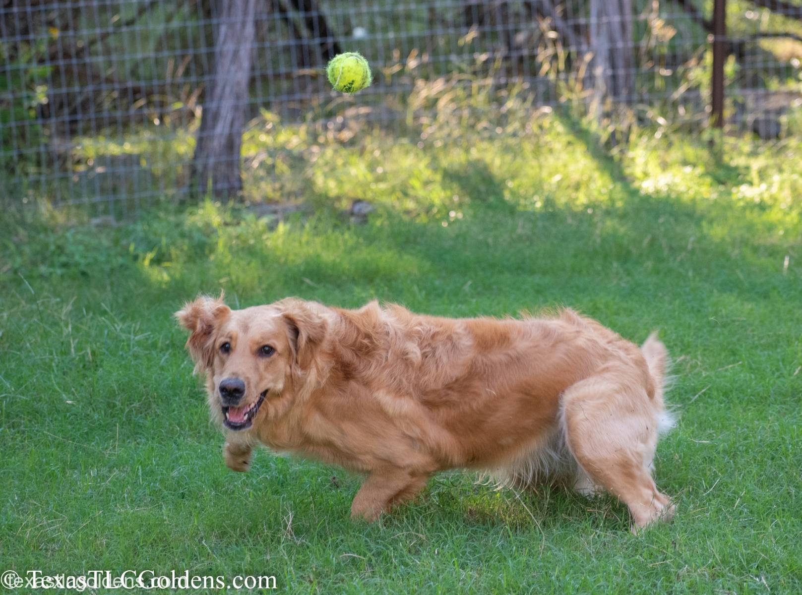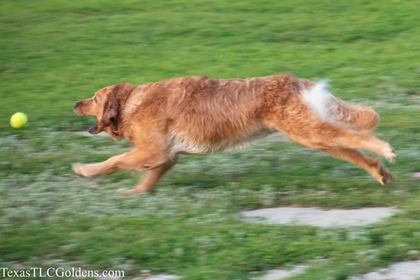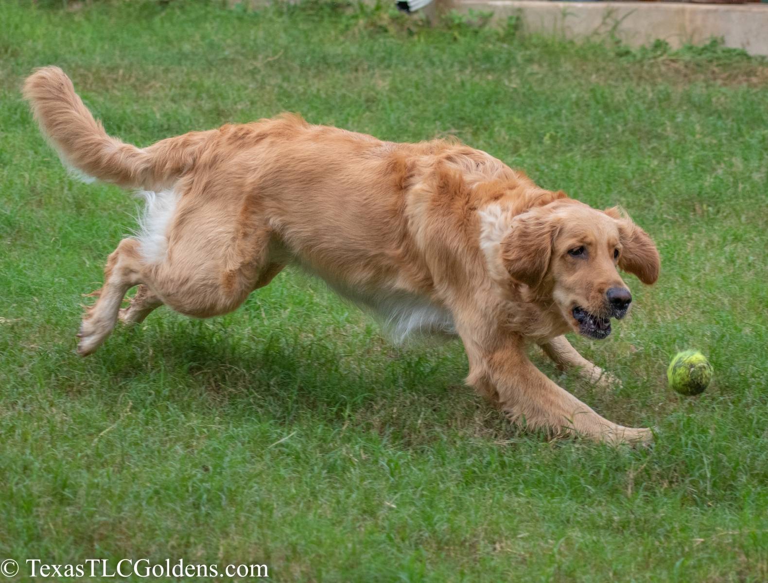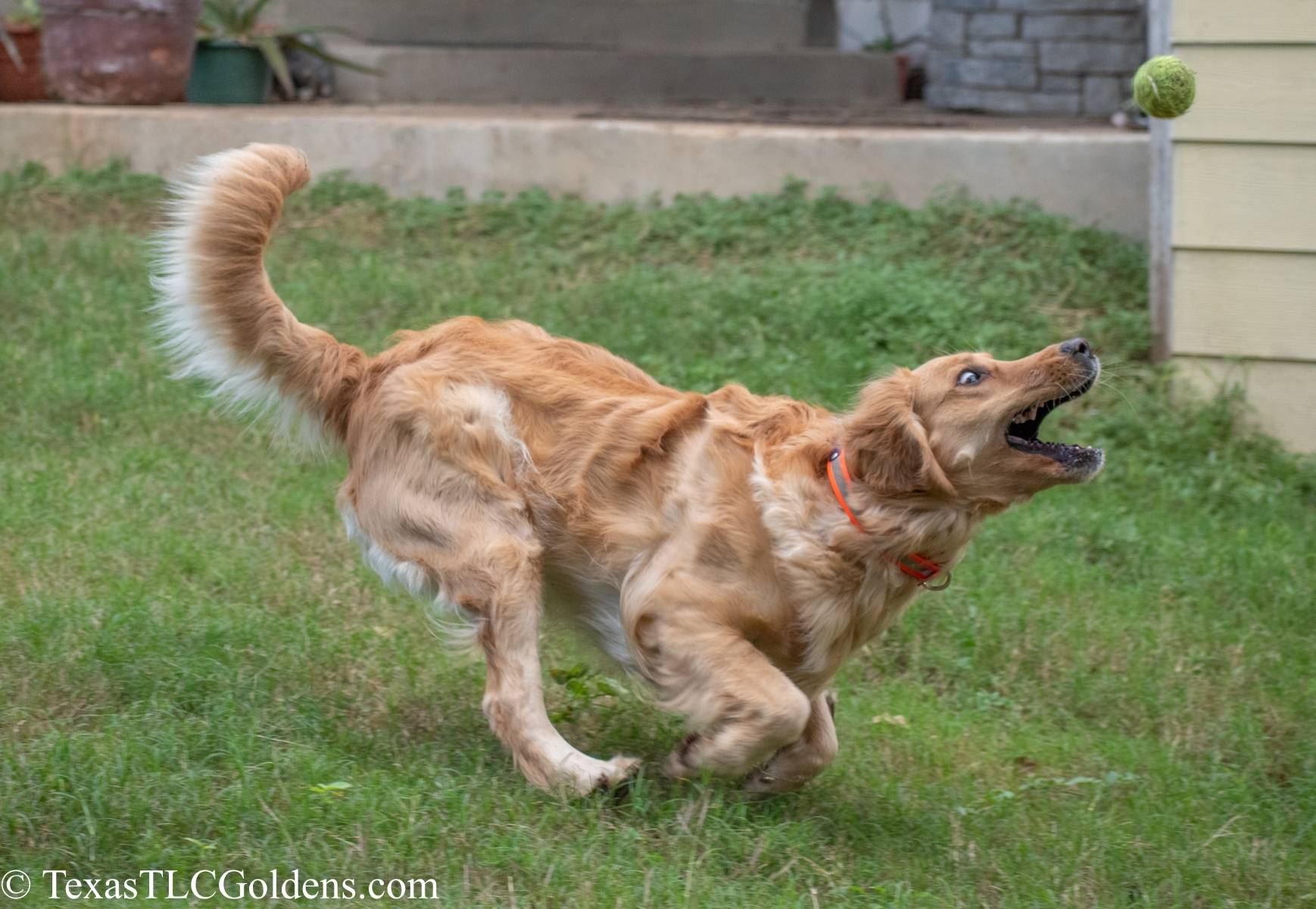 She is genetically clear, has OFA hip, elbow, heart and eye clearances and has always remained healthy. She is athletic and ball focused like no other dog we have ever seen; she lives to chase tennis balls. If it is cool outside, it’s unlikely the human throwing the ball will be able to last as long as she does. She still loves playing in the Texas heat but like any other long haired dog, she takes sensible breaks. She is very good at catching tennis balls in the air and in fact prefers that. If by chance she loses a thrown ball in the grass, it’s amazing to watch her automatically set up a search grid and find it by smell.