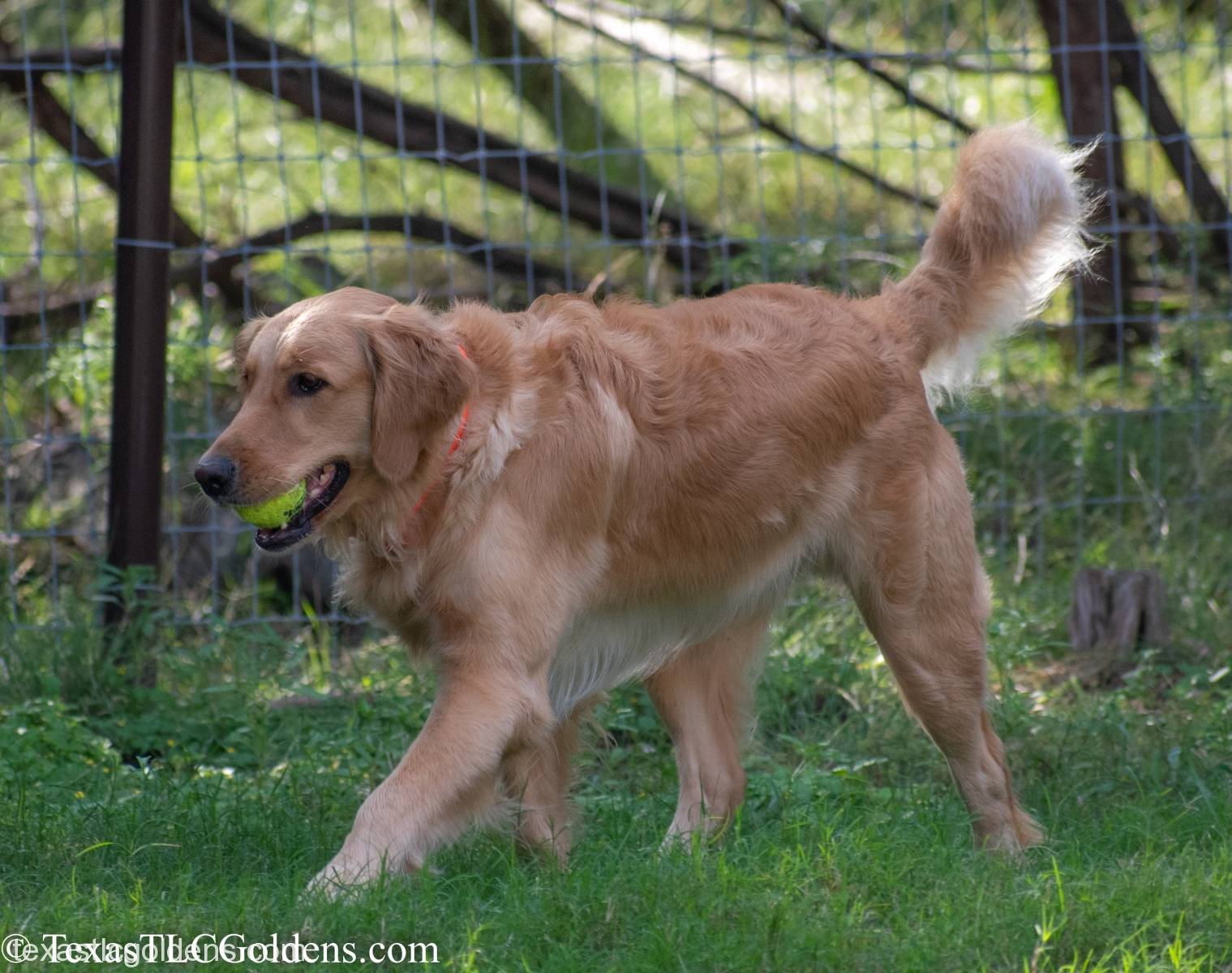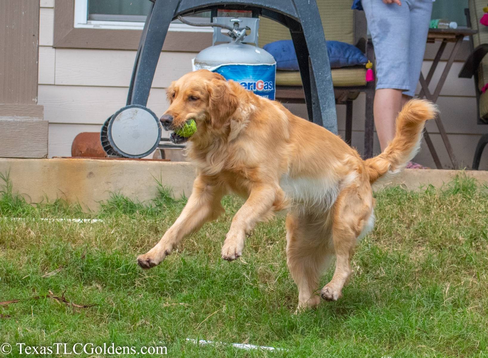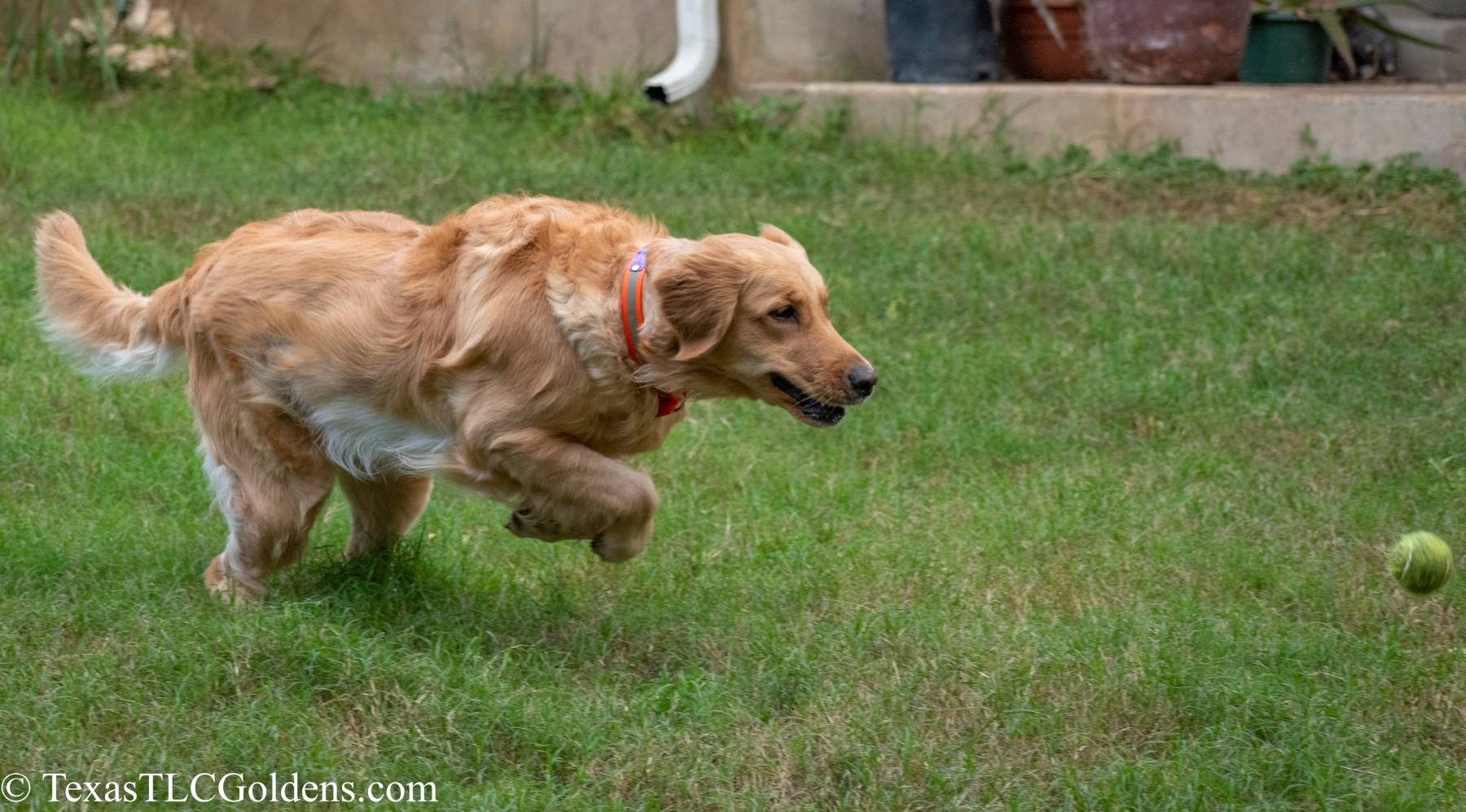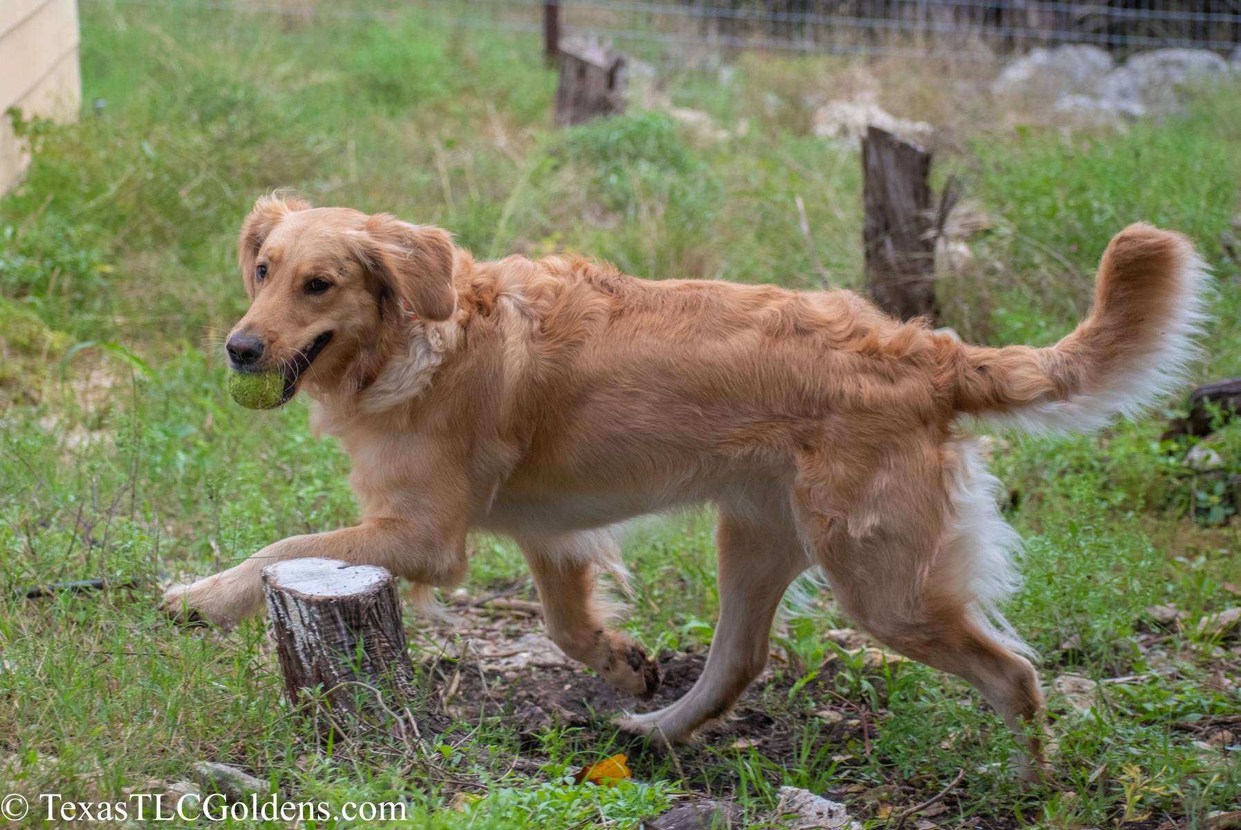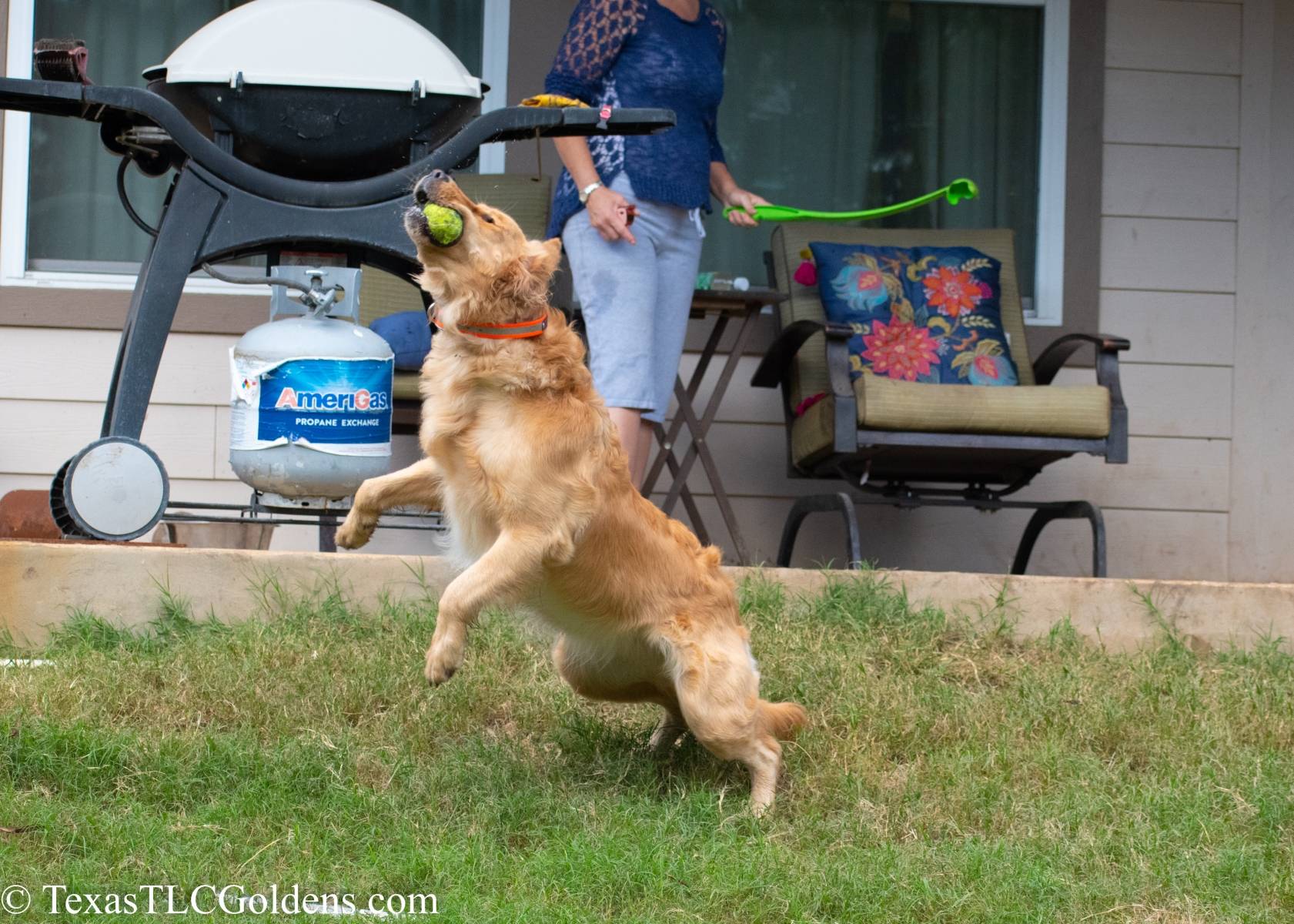 She is genetically clear, has OFA hip, elbow, heart and eye clearances and has always remained healthy. She is athletic and ball focused like no other dog we have ever seen; she lives to chase tennis balls. If it is cool outside, it’s unlikely the human throwing the ball will be able to last as long as she does. She still loves playing in the Texas heat but like any other long haired dog, she takes sensible breaks. She is very good at catching tennis balls in the air and in fact prefers that. If by chance she loses a thrown ball in the grass, it’s amazing to watch her automatically set up a search grid and find it by smell.